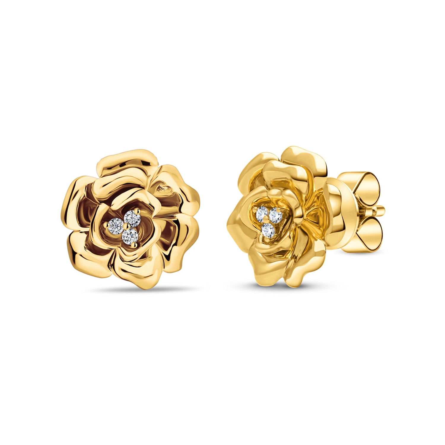 Złote kolczyki kwiaty wykonane z żółtego złota próby 585 zachwycają dbałością o każdy detal. Misternie ukształtowane płatki kwiatów tworzą trójwymiarowy efekt, nadając kolczykom wyjątkowy charakter. Subtelnie osadzone diamenty o łącznej masie 0,05 karata lśnią subtelnym blaskiem, podkreślając elegancję biżuterii. Zapięcie na sztyft zapewnia komfort i bezpieczeństwo noszenia. Te urocze kolczyki to doskonały wybór na prezent dla osoby, która ceni sobie ponadczasowe piękno i finezję. Kwiatek podkreśla delikatność i romantyczną stronę osobowości. Idealne zarówno na co dzień, jak i na specjalne okazje.